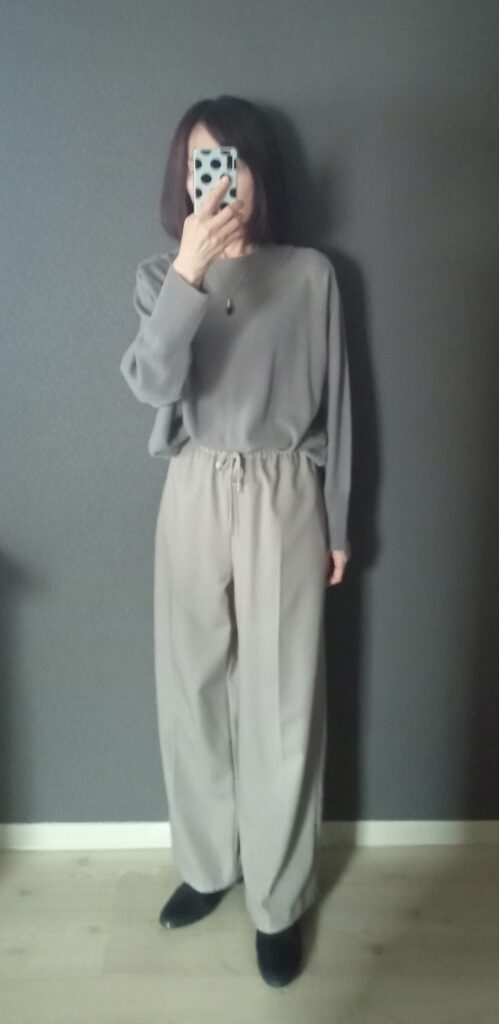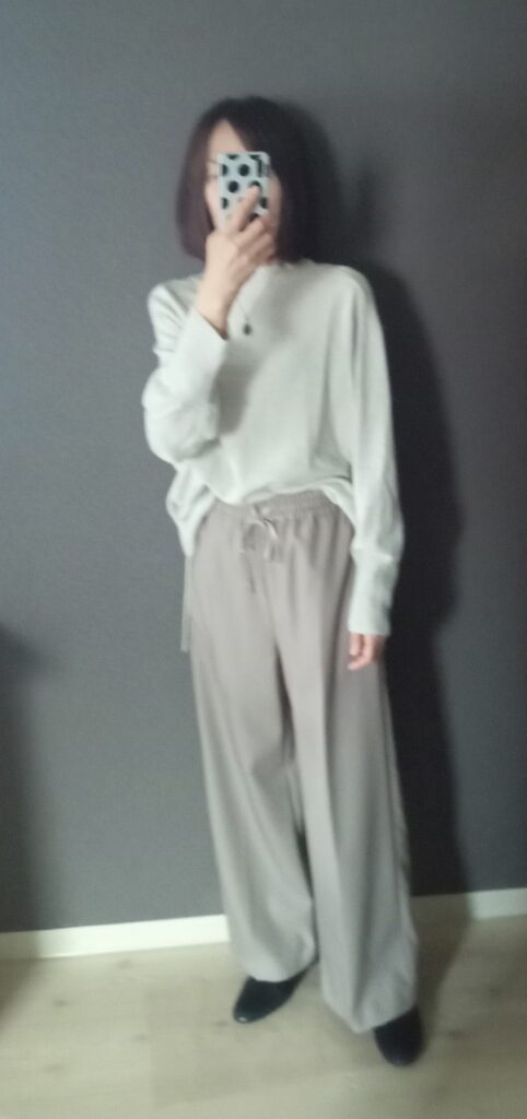 ベージュワイドパンツを軸にしたコーディネートを組みました。