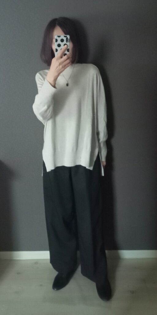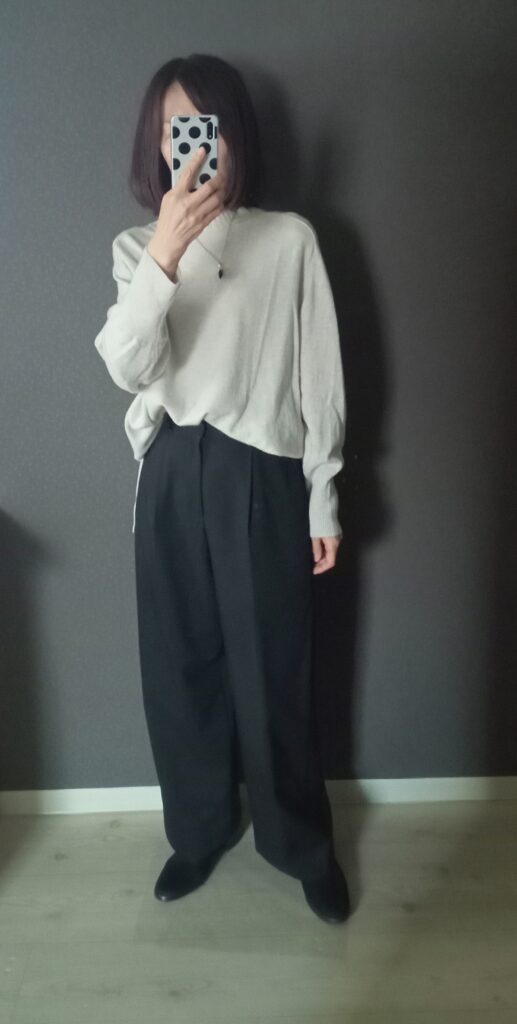 ブラックワイドパンツ×ライトグレーウールニット