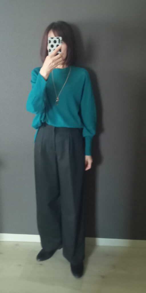 ブラックワイドパンツ×ブルーウールニット