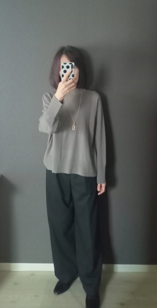 まずは、グレージュウールニットを合わせたコーディネートです。
