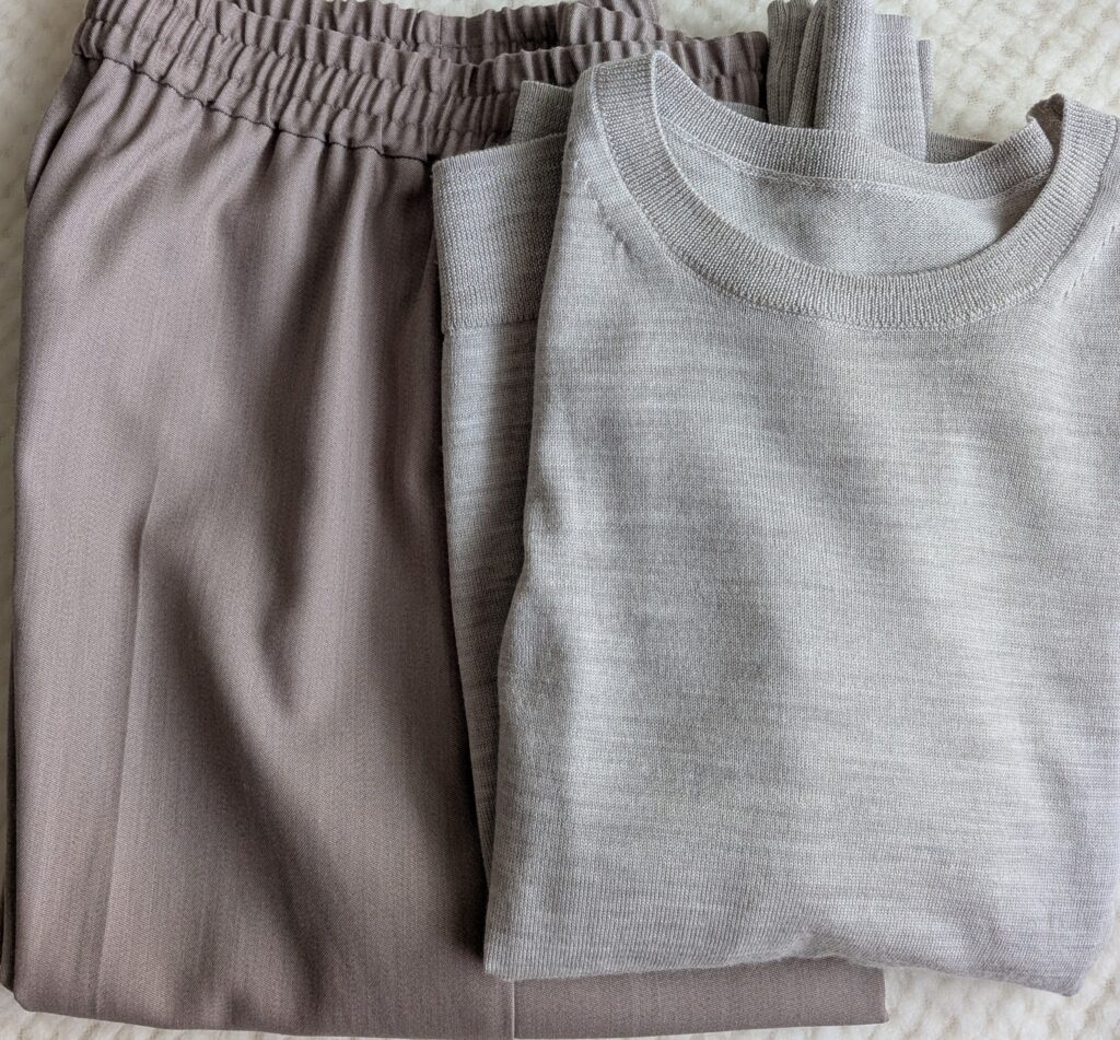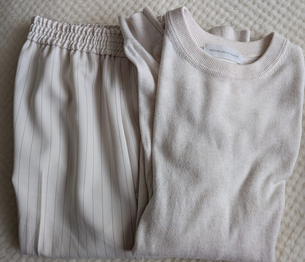 ベージュのトップスとボトムス