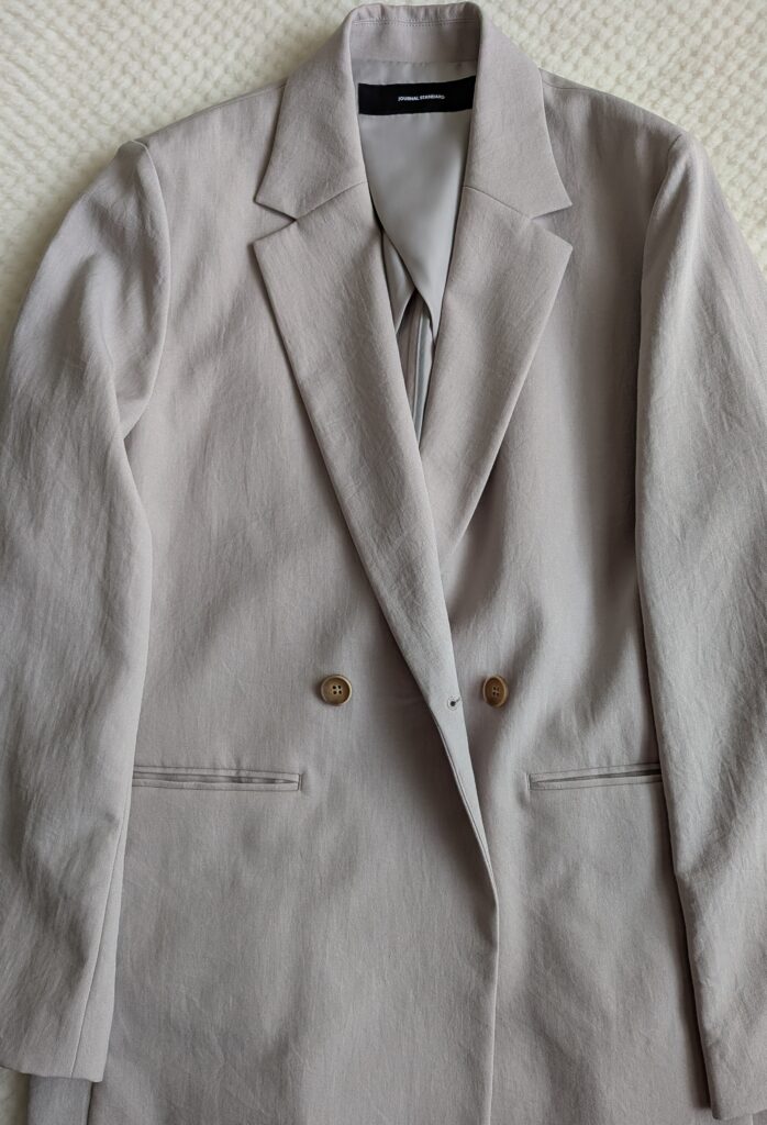 ⑦ベージュテーラードジャケット:麻混素材で、しわになりにくいです。インナーを変えて、真夏以外のスリー-シーズン使えます。