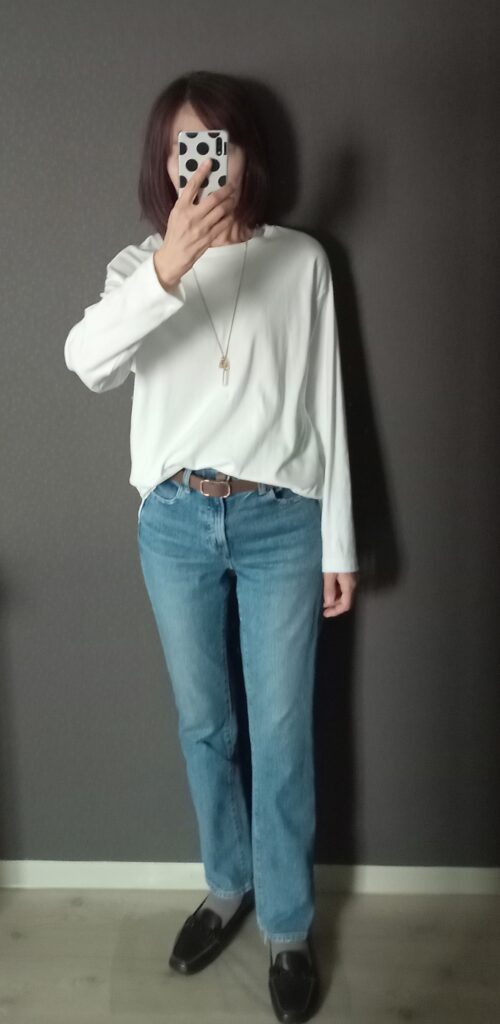 着丈が長すぎず、インしなくても丁度いいのでコーディネートしやすいトップスです。