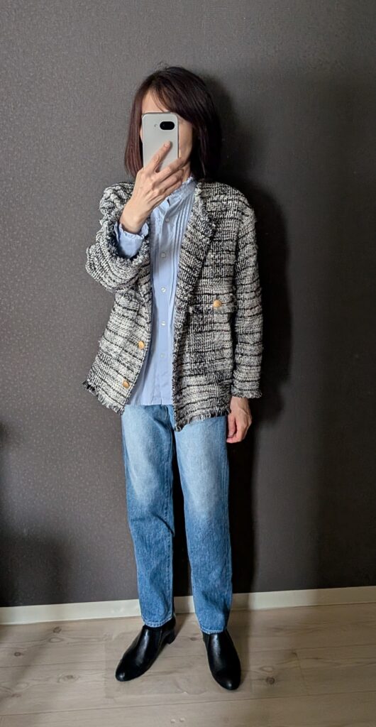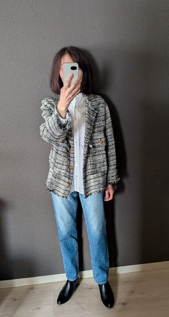 ・ツイードジャケット×デニムパンツの組み合わせが50代にちょうどいい。