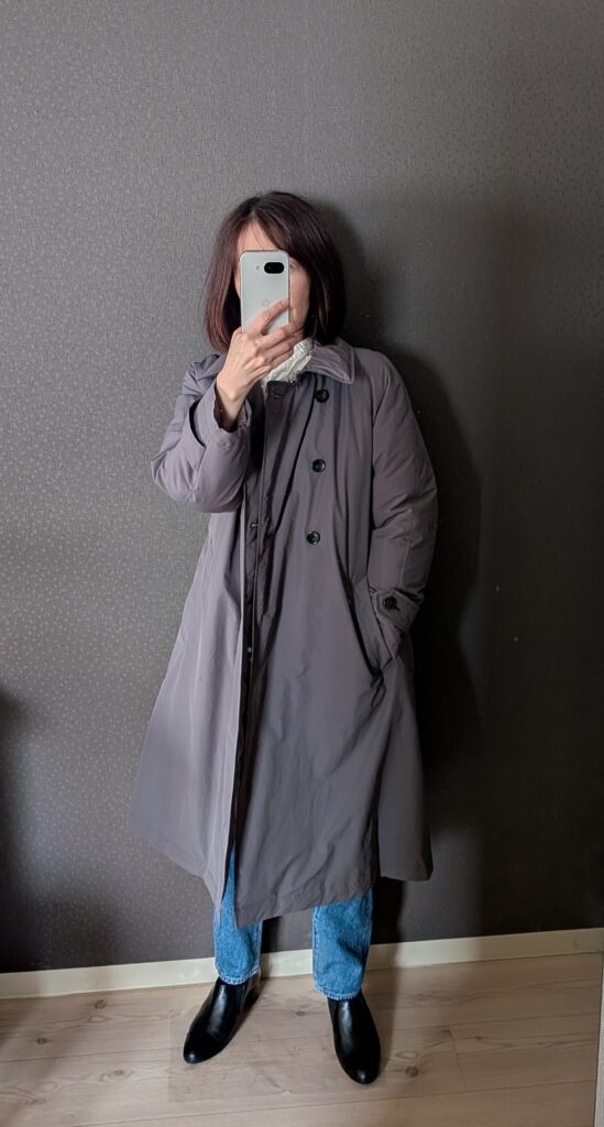 外出用のコートは、トレンチデザインのダウンコートです。