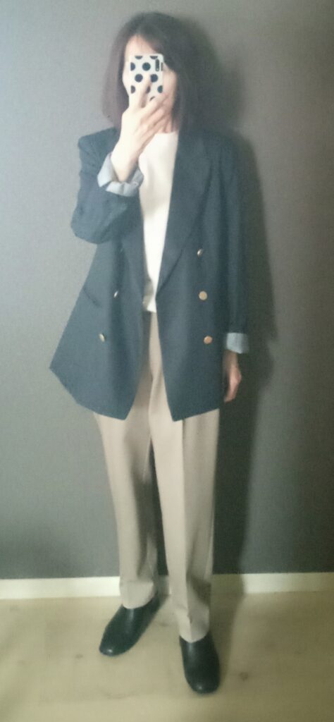 パンツのベージュが黄みのある色味なので、明るいインナーの方が相性がいいのかもしれませんね!