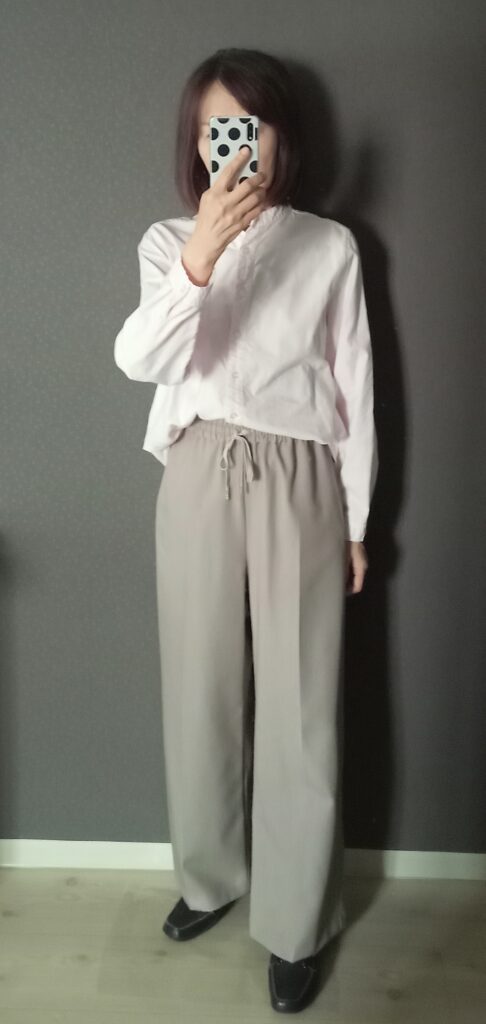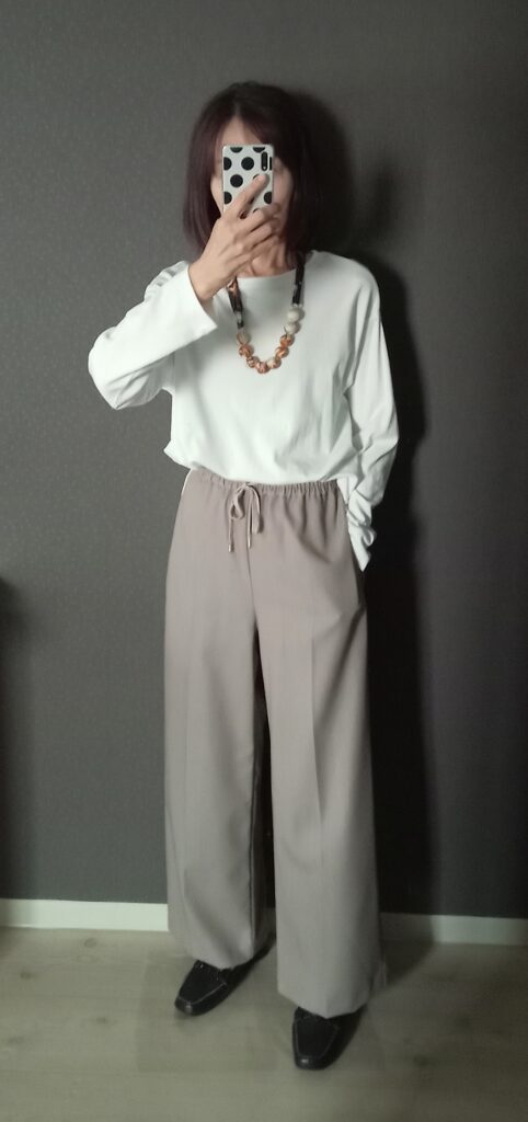最近購入したばかりのベージュワイドパンツでコーディネイトを組んでみました。