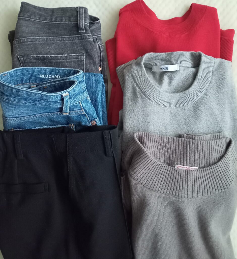・ボトムスは、定番のデニム2本と1本あると安心のブラックパンツで構成。