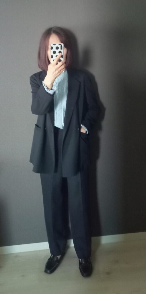 セットアップではないのですが、上下ネイビーでスーツっぽくなりましたね。