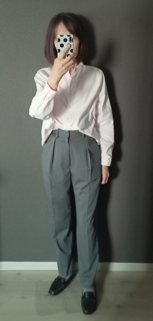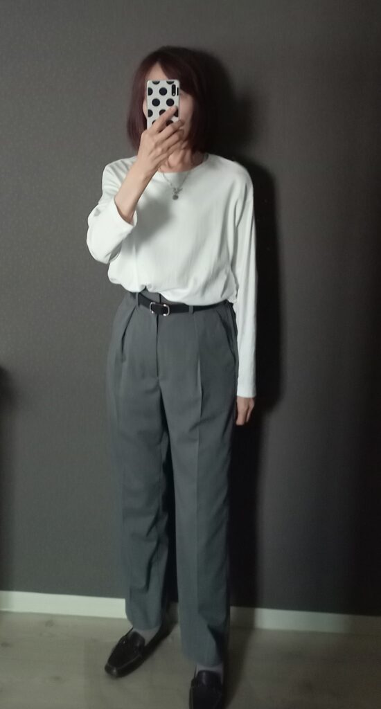 ・グレーパンツコーディネイトは、トップスの素材によって全体のシルエットが変わるので、自分の骨格を生かしたほうがいいかも。
