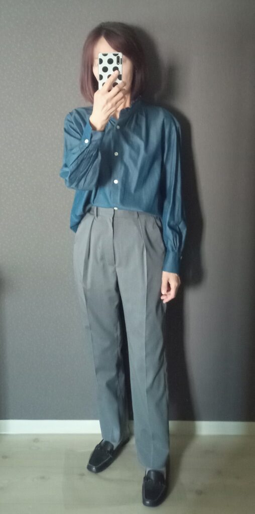 グレーテーパードパンツ×インディゴスタンドフリルブラウス